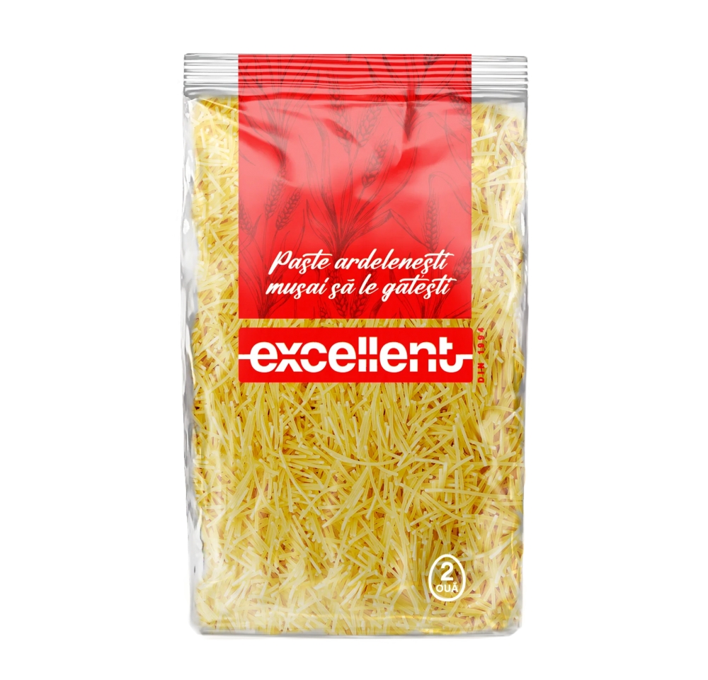Fidea Excellent este un sortiment de paste subțiri, delicate, produse din făină de grâu și ou (2 ouă/kg), perfecte pentru supe limpezi, supe de pui sau rețete simple pentru copii. Se fierbe rapid, are o textură fină și nu se lipește. Este una dintre cele mai iubite paste românești, prezentă în aproape orice bucătărie, pentru gustul său ușor și autentic.